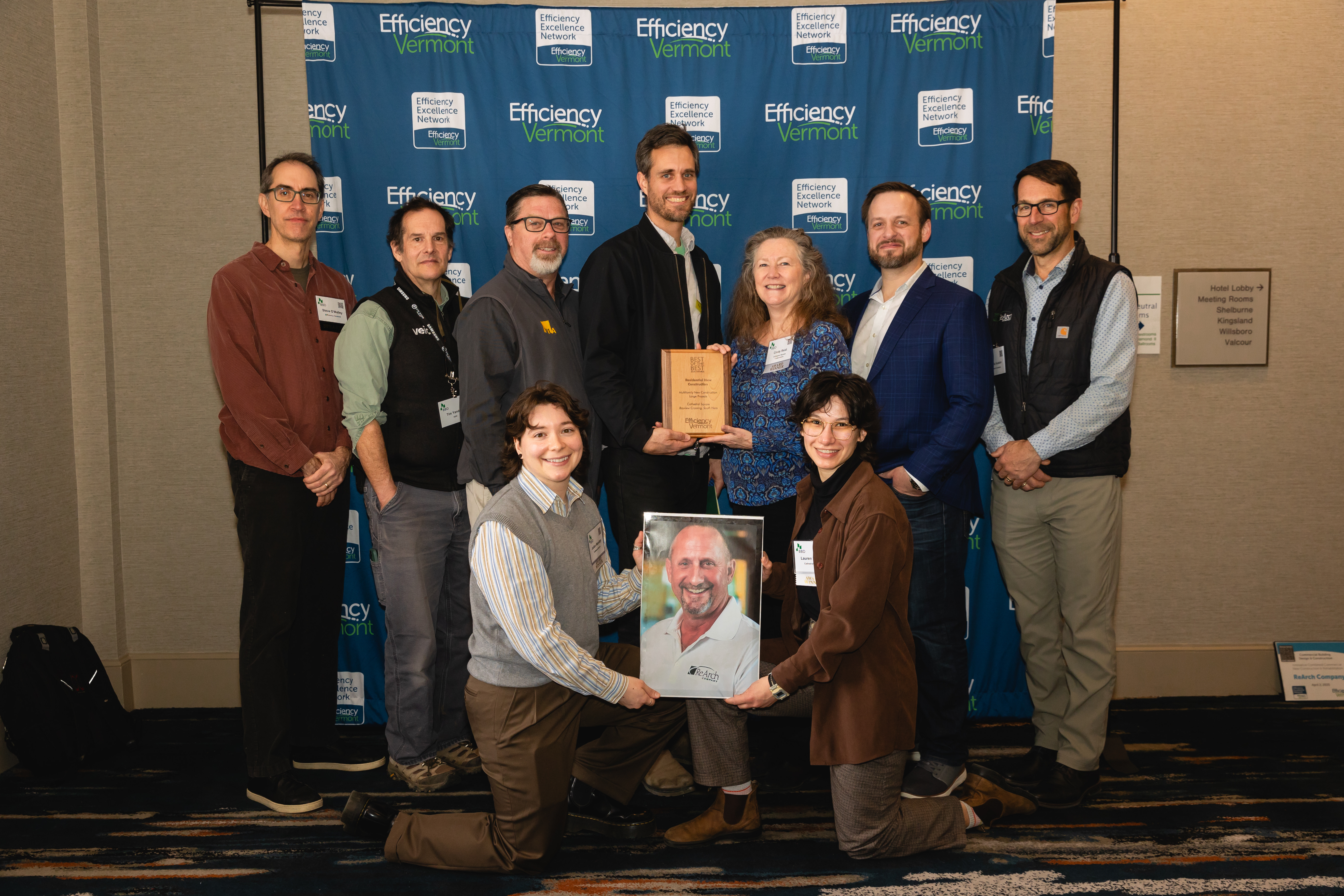 SOUTH HERO, VT — Cathedral Square’s Bayview Crossing in South Hero received Efficiency Vermont’s Best of the Best Award for Residential New Construction in the Multifamily Large Projects category at the Better Building by Design conference. Efficiency Vermont’s annual event brings together design professionals, leaders in building construction, and experts in climate workforce trades. Thirteen “Best of the Best” awards were given out to builders, architects, designers, and HVAC and plumbing installers for their commitment to energy excellence. Weimann Lamphere Architects designed the project and ReArch Company was the construction manager. Both firms accompanied Cathedral Square staff in receiving the award.